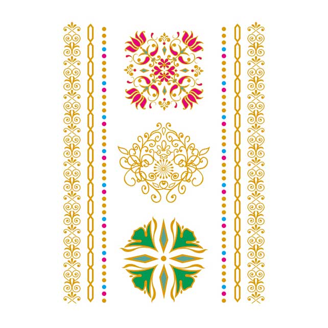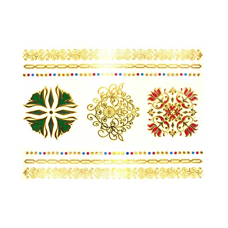 Ajutine tätoveering ehk ajutine tattoo näeb äge välja nii kätel, jalgadel kui ka igal pool mujal soovitud kehapiirkonnas. Metallik tattoo on metalli läikega ajutine tätoveering, mis on eriti kaunis suvisel päevitunud nahal. Kanna metallik tattoosid nagu ehteid! Metallik tattoo on veekindel ja püsib nahal 1-5 päeva. Tattoo lehe mõõdud on 15x21cm, lehel on mitmeid erinevaid motiive, mida saab vastavalt soovile kombineerida.